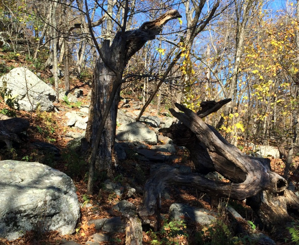 We turned west on the Link Trail, and continued west towards Semuhenna Trail. This trail’s unusual name is the result of spelling Anne Humes backwards. The trail took us further from the summit but the terrain was among the best we’d encountered so far: still rocky and challenging at times but also with nice stretches of mostly-flat wooded paths.